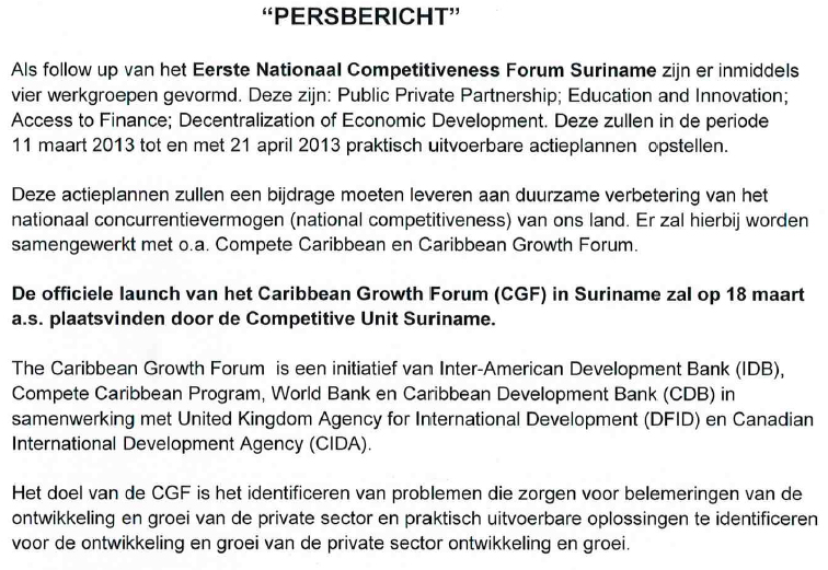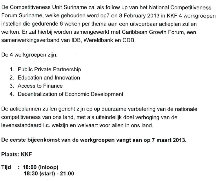 Donderdag 07 februari was er in de Business Booster Building van het KKF een teach in voor de werkgroepen die aan een actieplan zullen werken voor duurzame verbetering van de nationale competitiveness van Suriname.